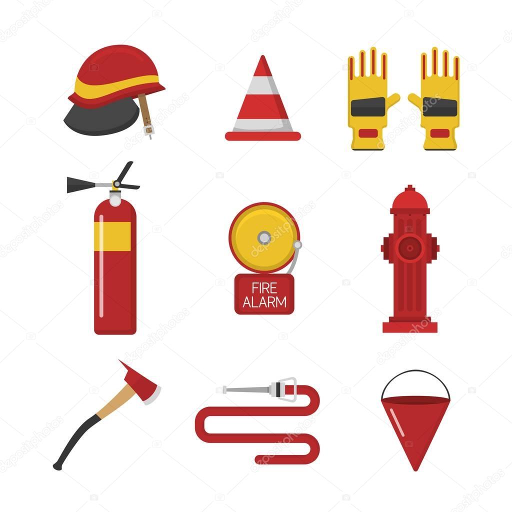 Fire safety vector with fire ax, fire extinguisher, fire helmet, sign fire exit, hydrant booster, fire alarm vector.